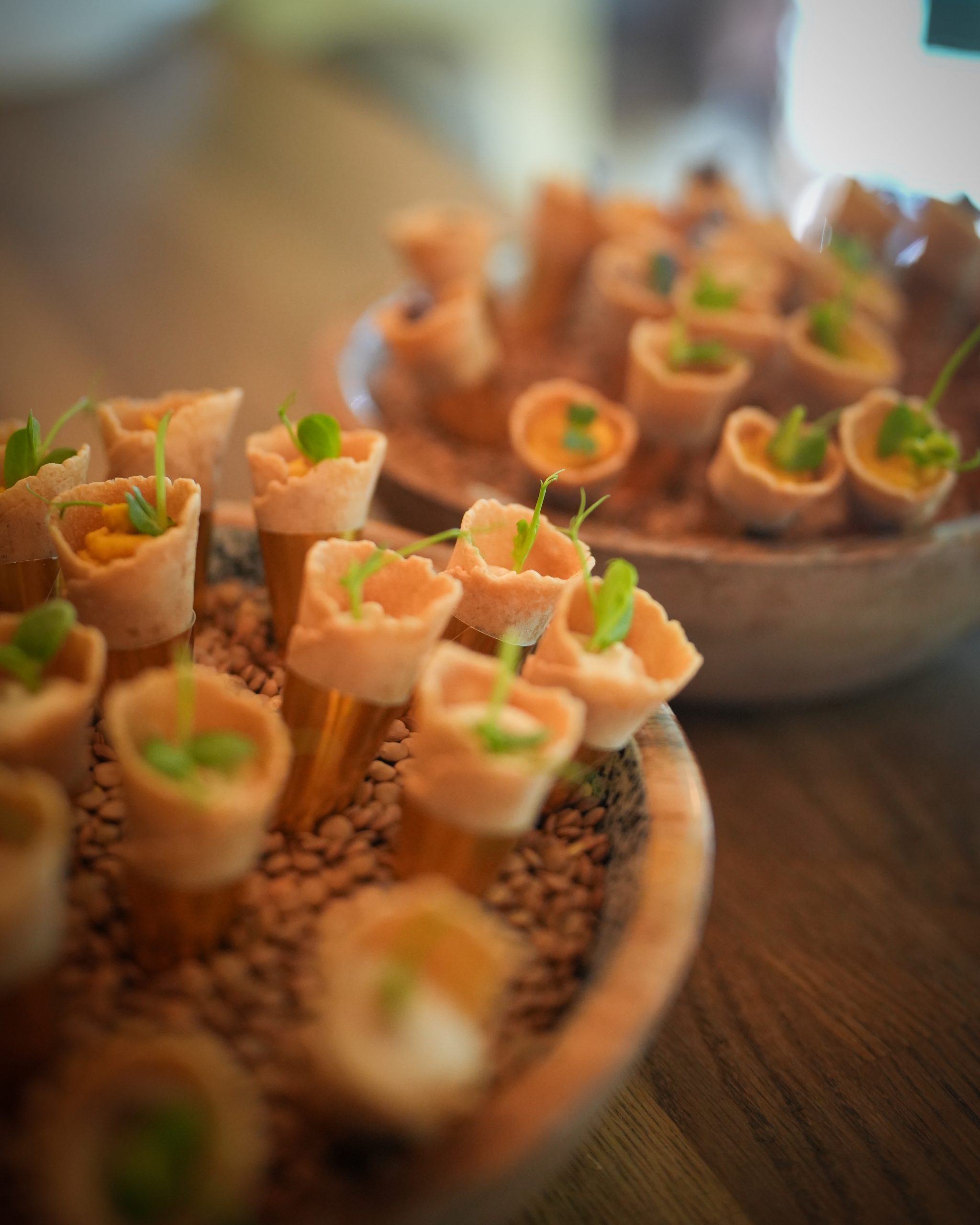 Entdecken Sie unser herbstliches Fingerfood Catering Berlin – elegant, kreativ und voller saisonaler Aromen. Statt klassischer Käsewürfel oder einfacher Spieße erwartet Sie eine feine Häppchen Auswahl mit Käferbohnen-Salat, karamellisierten Walnüssen und Ziegenkäse, Crispy Buttermilk Chicken mit Chicorée und Preiselbeere sowie Knuspertartelettes mit Parmesanfrischkäse und Trüffel.